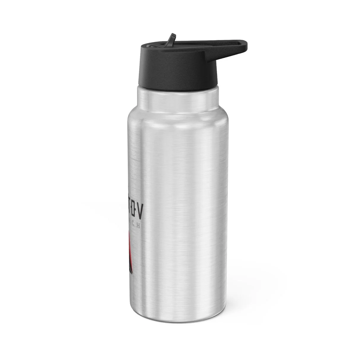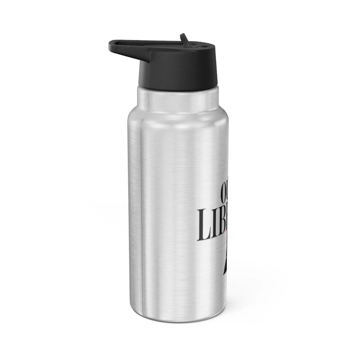 .: Materials: stainless steel bottle, black plastic screw-on cap
